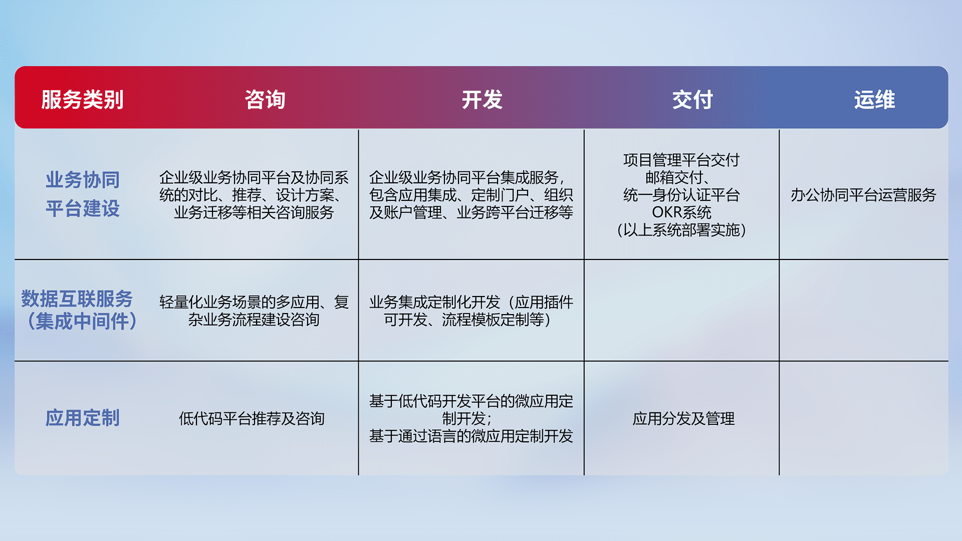 针对钉钉、、、企微、、、IDaas等平台级产品提供产品的规划、、方案、、、交付、、、、定制化开发等服务,,,实现如统一协同办公、、、智能客户服务、、、、混合会议管理、、、智能数据查询、、、、等业务场景,,,,实现数字化转型。。。
