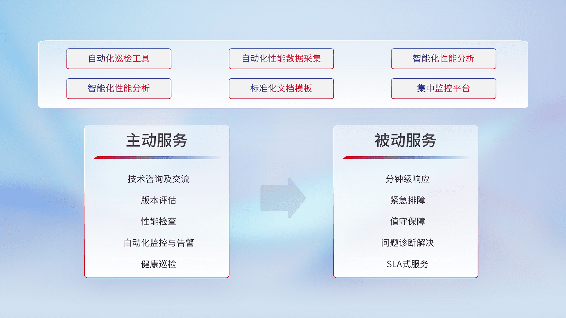智能化工具和标准化文档,,,保障服务质量,,提供主动服务(包含技术咨询、、版本评估、、性能检查、、、、自动化监控与告警、、、健康巡检)和被动服务包含(分钟级响应、、、紧急排障、、值守保障、、、、问题诊断解决、、、SLA服务)。。。。