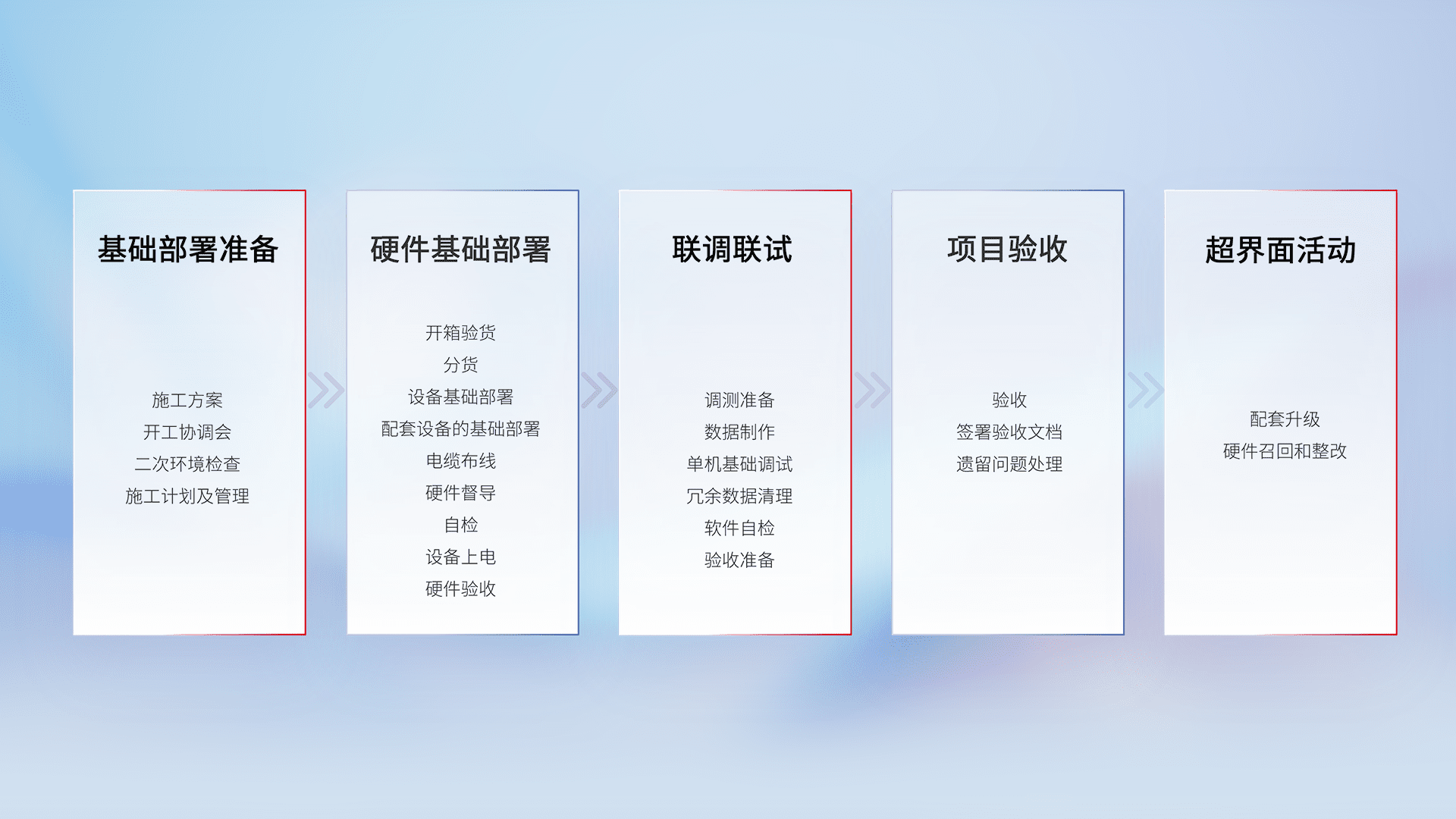 从基础部署准备、、、、硬件基础部署、、联调联试、、、项目验收、、越界面活动的全过程可追溯,,,,保证施工质量和进度。。